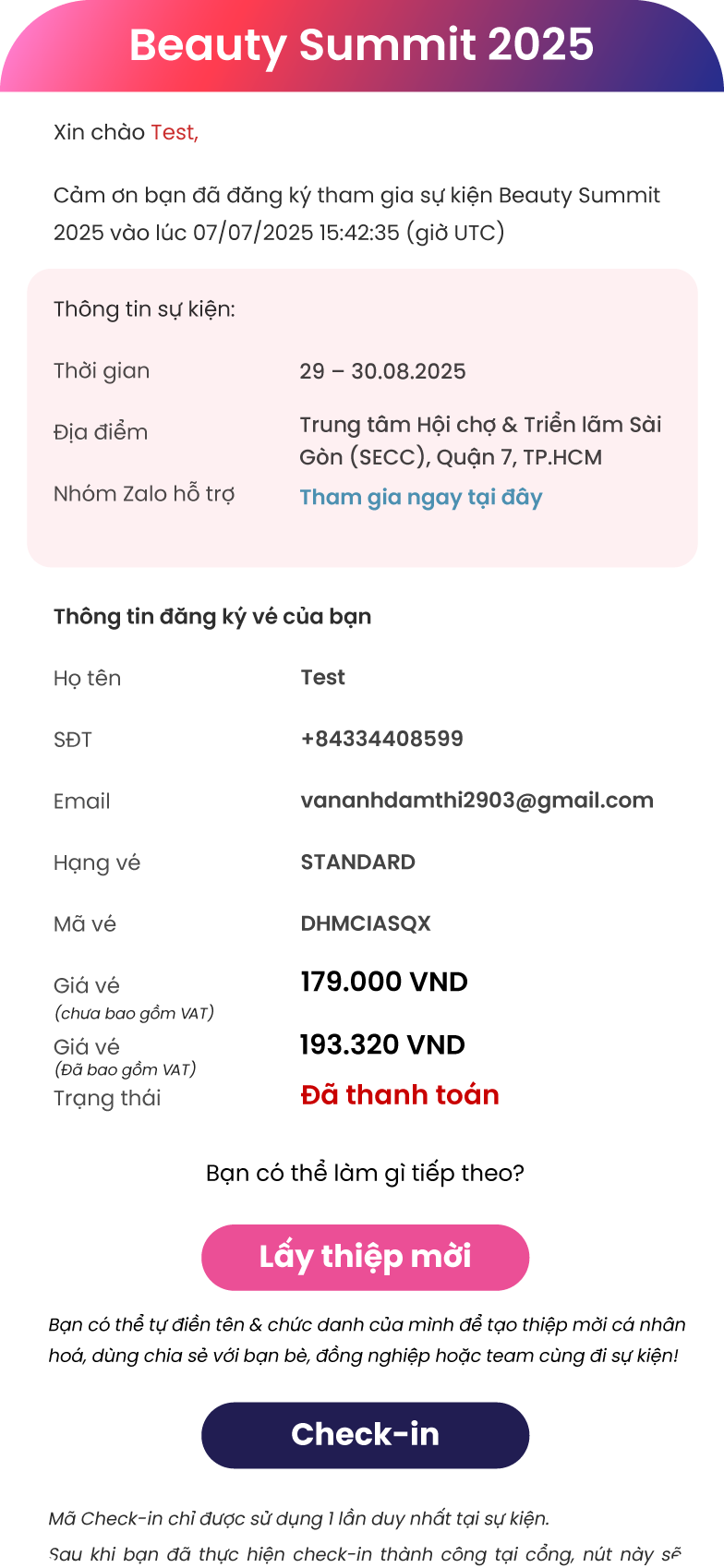 Lưu ý quan trong: Mỗi mã vé chỉ được check-in 01 lần duy nhất. Quý khách vui lòng không check-in trước thời gian diễn ra sự kiện chính thức để đảm bảo quyền lợi của mình